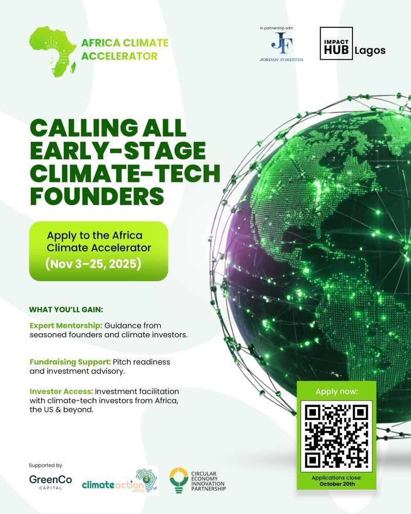 Apply to the Africa Climate Accelerator by Impact Hub Lagos for a chance to scale your climate-tech solution and connect with global investors.